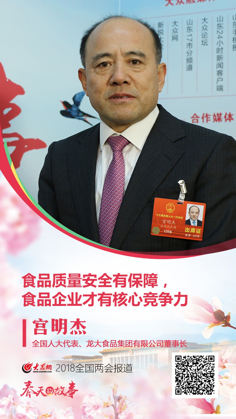 董事长宫明杰在做客大众网“姜洋有约”栏目时说,绿色源头建设、国家级的检测中心和产品质量追溯体系,是龙大打造食品安全体系的三大“法宝”,这也是龙大占居食品行业领先地位的核心竞争力。