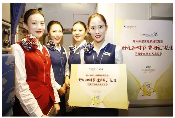 2018年10月17日,即农历九月初九,在SC4698西安—青岛的航班上,龙大粮油携手山东航空打造了一场共贺重阳的“好礼知时节 重阳礼‘花生’”主题航班,精心为消费者准备了一份“油”爱的礼物,让人们带着爱回家。