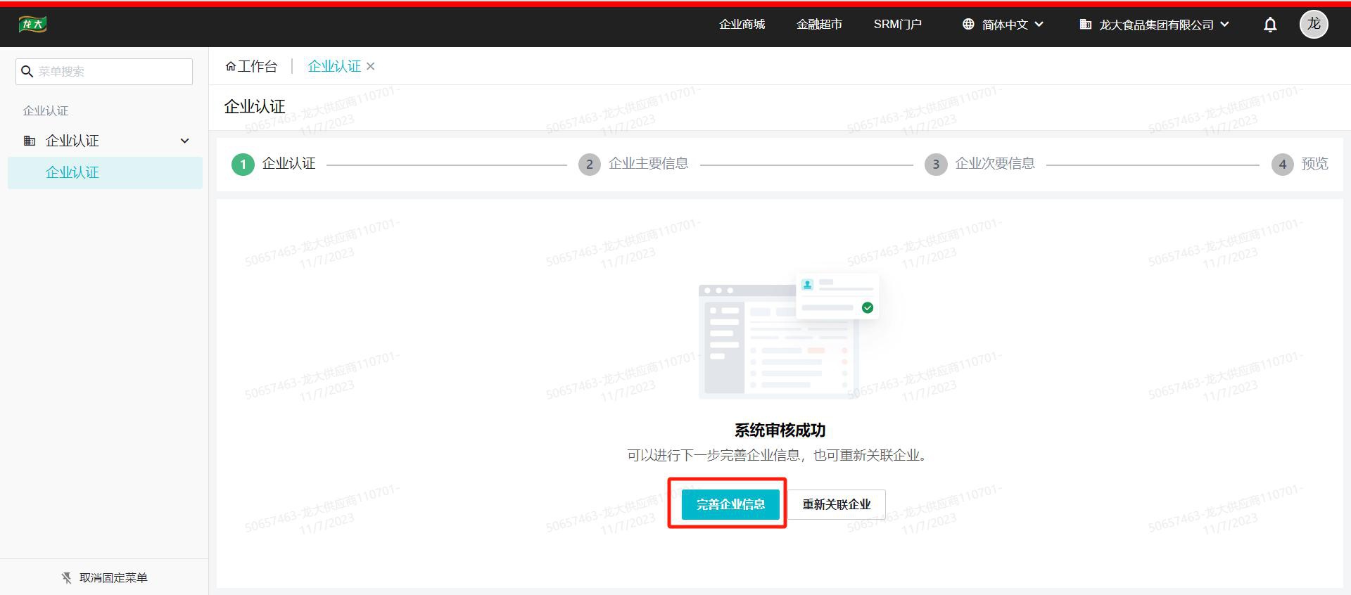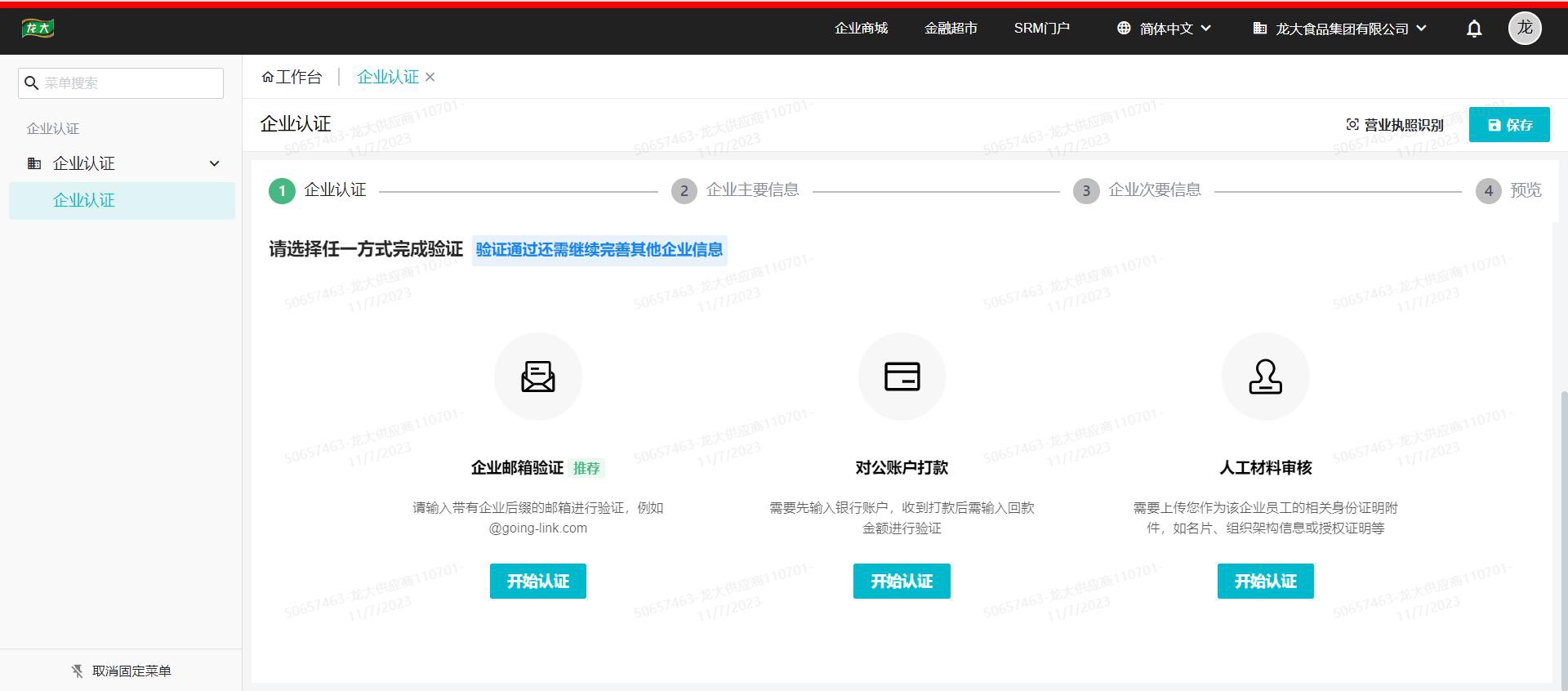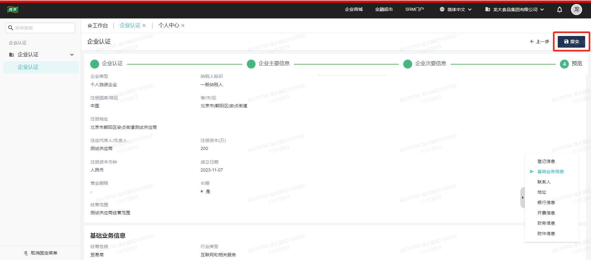 4、企业验证通过后,依次填写企业主要信息、企业次要信息、预览检查无误后,点击右上角提交认证审核。注册认证过程中如遇问题,可联系甄云客服:400-116-0808解决,或与业务对接人联系。
