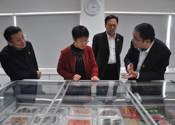 于涛一行参观了集团样品室和检测中心,九色视频 总经理张德润向于涛详细介绍了集团外贸出口、肉食品和粮油三大业务板块的发展情况,并对集团全产业链的发展模式,构建的食品安全保证体系做了说明。随后张总就于涛部长关心的公司党建和“两学一做”情况作了详细汇报。