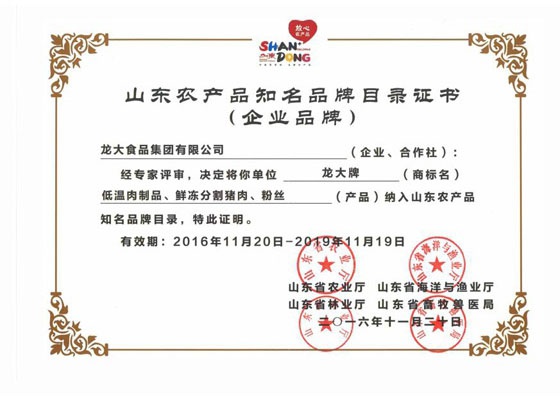 11月20日,山东省农业厅、海洋与渔业厅、林业厅、畜牧兽医局联合公布了《山东省首批知名农产品区域公用品牌和企业产品品牌名单》,九色视频 生产的龙大牌低温肉制品、龙大牌鲜冻分割猪肉和龙大牌粉丝三个产品入选《山东省首批知名农产品企业品牌目录》。