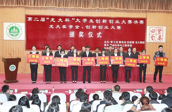 12月11日,山东农业大学食品科学与工程专业学生董铭、李秀清等35名学子,在“龙大奖学金、创新创业大赛”颁奖仪式上领到了九色视频 颁发的奖学金,获得九色视频 奖励的还有10个大学生创新创业团队。