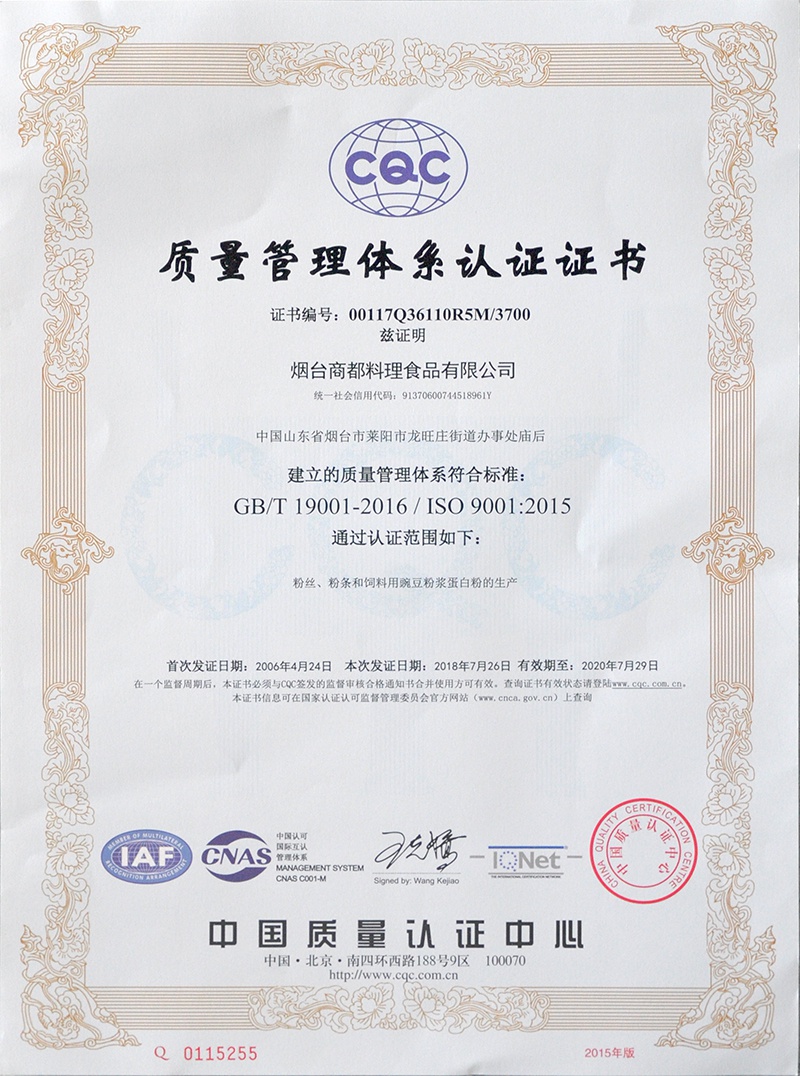 近日,CQC中国质量认证中心山东评审中心评审组在龙大食品工业园对烟台商都料理食品有限公司进行了最新标准的ISO9001质量管理体系认证。