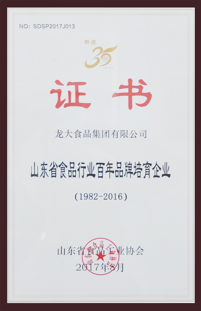 龙大荣获“山东食品行业百年品牌培育企业”称号